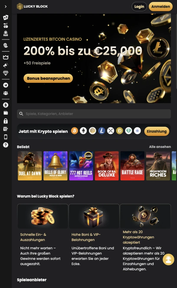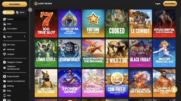 Wir arbeiten mit bekannten Entwicklern für Slots und Live-Dealer-Titel, darunter Pragmatic Play, Evolution Gaming, NetEnt, Play'n GO, Microgaming, Red Tiger Gaming, Nolimit City, Hacksaw Gaming, Relax Gaming und Big Time Gaming. Diese Vielfalt hilft uns, häufig Updates zu liefern und unterschiedliche Spielstile zu unterstützen. Spiel-RTP und Features werden vom Anbieter festgelegt und, sofern verfügbar, innerhalb von LuckyBlock Casino angezeigt.
