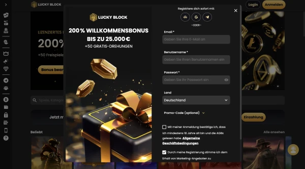 Ein Konto zu erstellen geht schnell, und die Verifizierung kannst du abschließen, wenn du bereit bist auszuzahlen oder wenn wir aus Sicherheitsgründen Prüfungen anfordern. Wenn du bereits ein Konto hast, ist der LuckyBlock Login über den Website-Header auf Desktop- und mobilen Browsern verfügbar. Wir halten den Ablauf kurz, damit du ohne zusätzliche Schritte zur Kasse und in die Spiellobby gelangst. Wenn du bei Casino LuckyBlock spielst, achte darauf, dass deine persönlichen Angaben mit deinen Dokumenten übereinstimmen, um spätere Verzögerungen zu vermeiden.